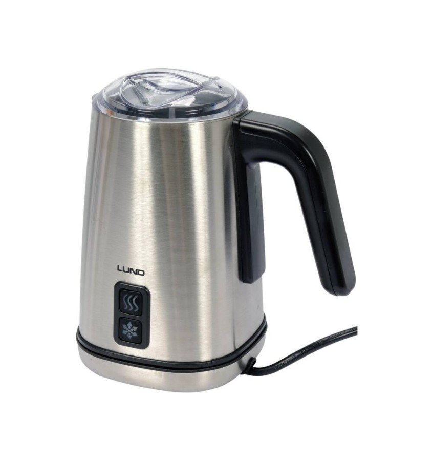 Spieniacz do mleka marki LUND o mocy 500W i trzech automatycznych funkcjach – spieniania na zimno, spieniania na ciepło oraz podgrzewania mleka. Maksymalna pojemność spieniania to aż 160ml, zaś podgrzewania mleka 250ml. Obudowa urządzenia wykonana z estetycznej i trwałej stali nierdzewnej.