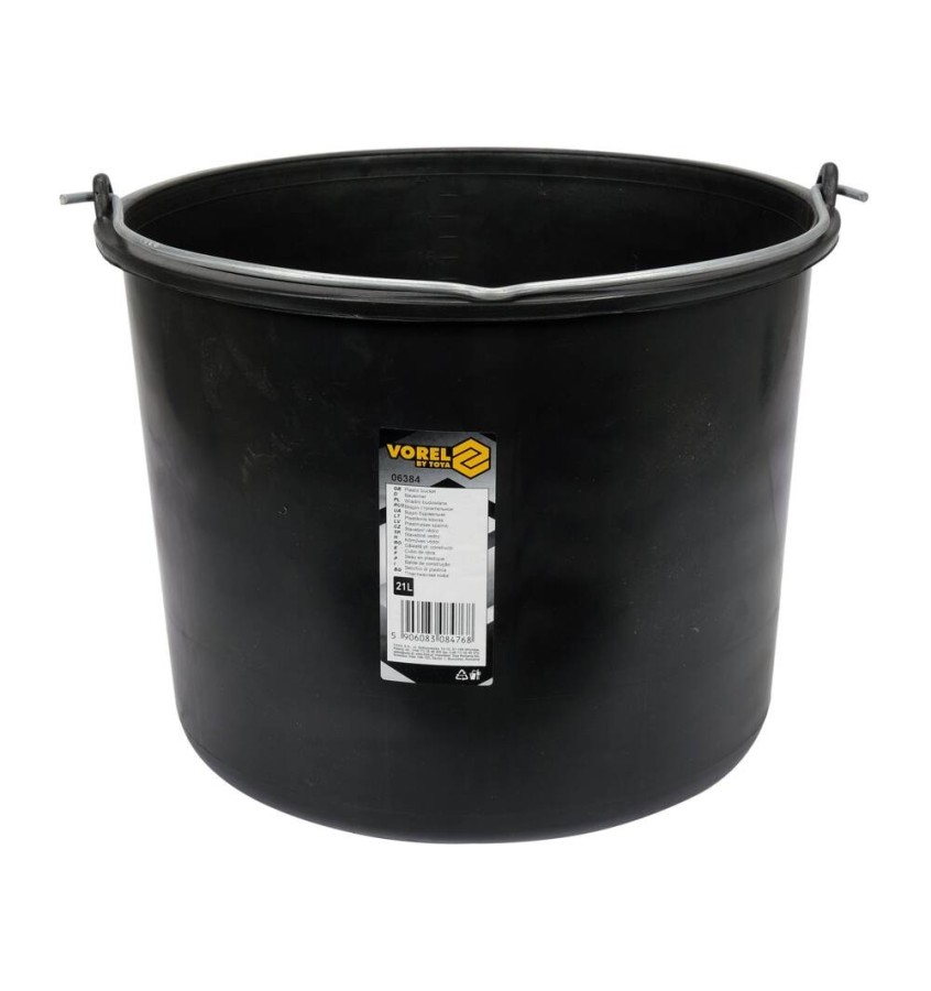 Wiadro budowlane wysokiej jakości wykonane z mocnego i elastycznego tworzywa, odporne na pęknięcia i złamania. posiadające metalową rękojeść.