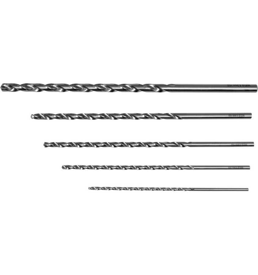 Zestaw wierteł do metalu o długości całkowitej od 150 mm do 240 mm. Wierzcholek wierteł ostrzony krzyżowo, tzw. split point 118°.