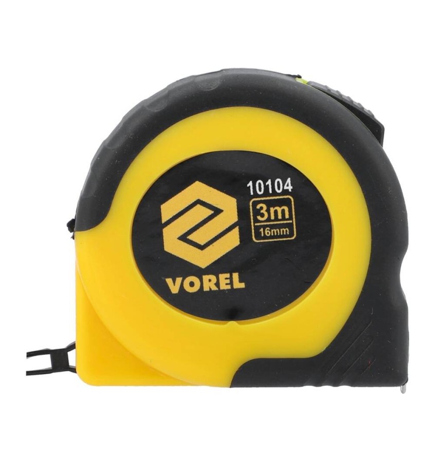 Taśma stalowa o długości 3 m i szerokości 16 mm zakończona ruchomym hakiem. Obudowa z klawiszem blokującym wykonana z tworzywa wzmocniona gumowymi nakładkami. Kaseta posiada klips do przypinania.