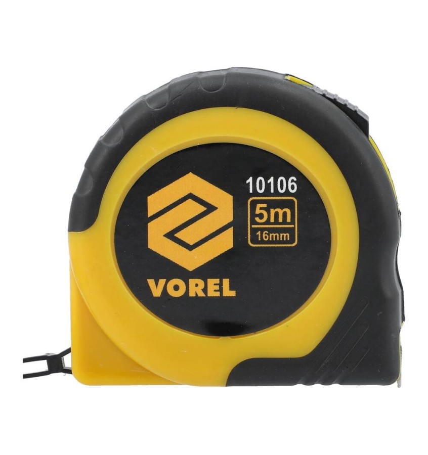 Taśma stalowa o długości 5 m i szerokości 16 mm zakończona ruchomym hakiem. Obudowa z klawiszem blokującym wykonana z tworzywa wzmocniona gumowymi nakładkami. Kaseta posiada klips do przypinania.