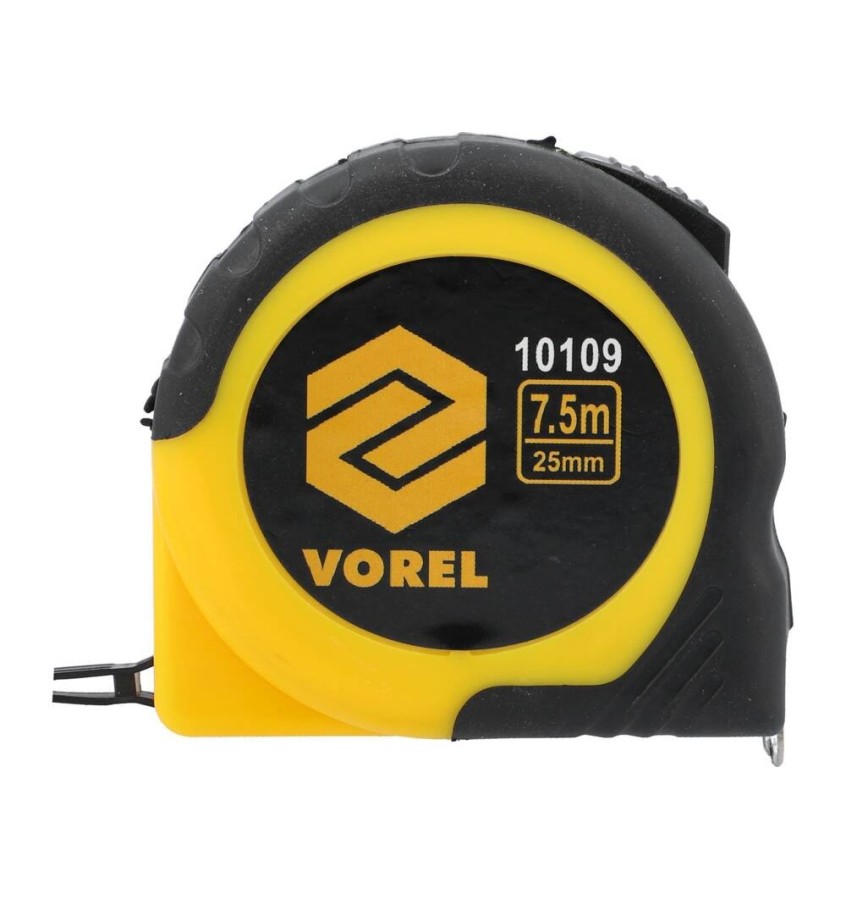 Taśma stalowa o długości 7,5 m i szerokości 25 mm zakończona ruchomym hakiem. Obudowa z klawiszem blokującym wykonana z tworzywa wzmocniona gumowymi nakładkami. Kaseta posiada klips do przypinania.