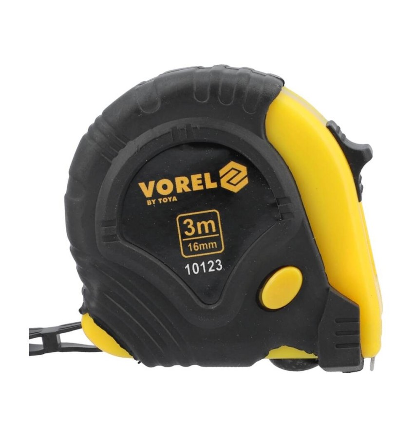 Miara z taśmą stalową o długości 3 m i szerokości 16 mm zakończoną ruchomym hakiem. Obudowa wykonana z tworzywa wzmocniona gumową osłoną.