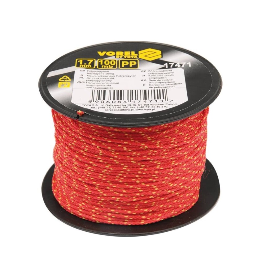 Profesjonalny sznur murarski wykonany z przędzy polipropylenowej, metodą plecenia na oplatarce.