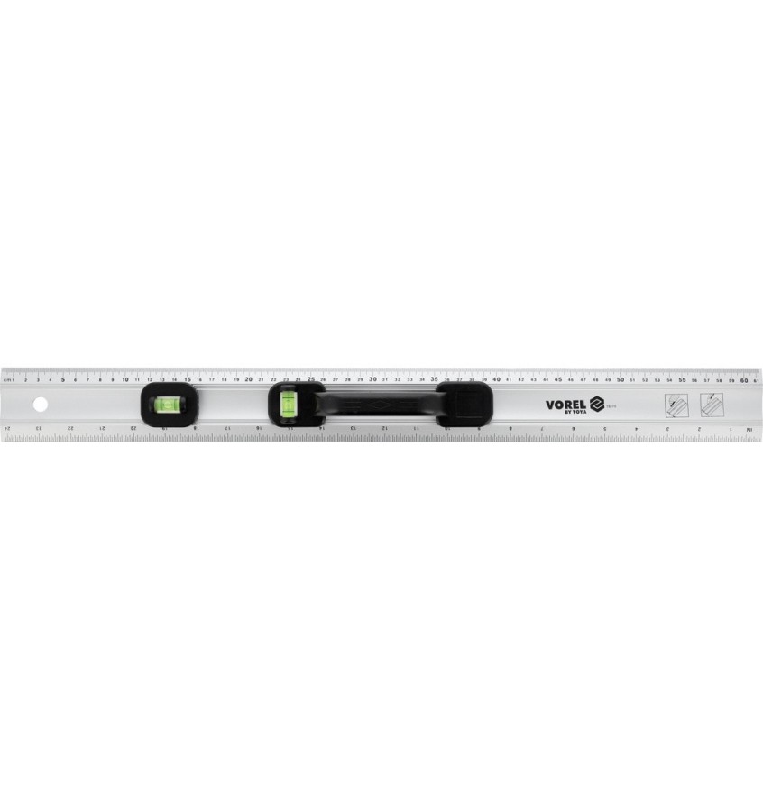 Przymiar wykonany z anodyzowanego aluminium, zaopatrzony w uchwyt z tworzywa i dwie libele do wyznaczania pionu i poziomu. Cechowany obustronnie podziałką milimetrową i calową naniesioną w kolorze czarnym.