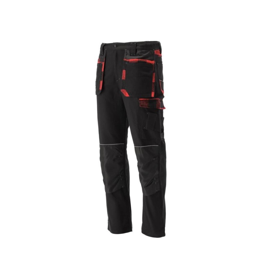 Czerwono-czarny materiał typu flanela na kieszeniach pełni funkcję dekoracyjną, natomiast z tyłu pod pasem poprawia komfort, dopasowanie i właściwości termiczne w tej części ciała.