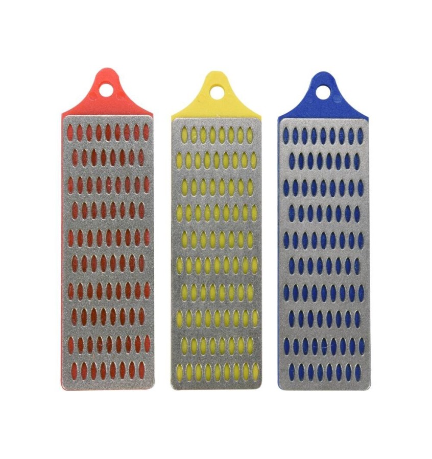 Zestaw trzech osełek diamentowych mini. Budowa - nasyp diamentowy na perforowanej blasze stalowej.