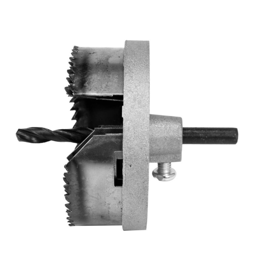 Zestaw siedmiu pił otworowych mocowanych w uchwycie napędzanym wiertarką elektryczną.