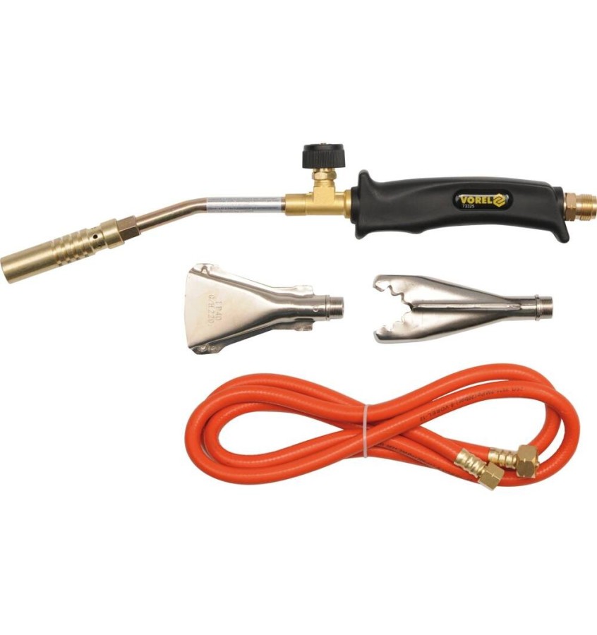 Zestaw palników gazowych przeznaczony do prac instalacyjnych i wielu zastosowań w innych branżach. W skład zestawu wchodzi uniwersalny uchwyt, specjalny 2m wąż z przyłączami do butli gazowej i uchwytu oraz dysze kształtujące płomień. Możemy korzystać z dyszy punktowej 17mm, dyszy 22mm z płomieniem okalającym lub płaskiej dyszy 40mm do nagrzewania i opalania.