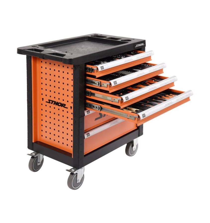 Szafka serwisowa z narzędziami marki STHOR. Posiada 6 szuflad na prowadnicach kulkowych wyposażonych w 12 plastikowych modułów z narzędziami. Szafka serwisowa STHOR zawiera 302 specjalnie wyselekcjonowane narzędzia. Profile szafki wykonane z blachy stalowej. Centralny zamek oraz zamknięcie dla każdej szuflady. Narzędzia wykonane ze stali CrV. Szafka posiada narożne odbojniki, które chronią przed przypadkowym uszkodzeniem, np. karoserii samochodu. Blat wykonany z wytrzymałego polipropylenu.