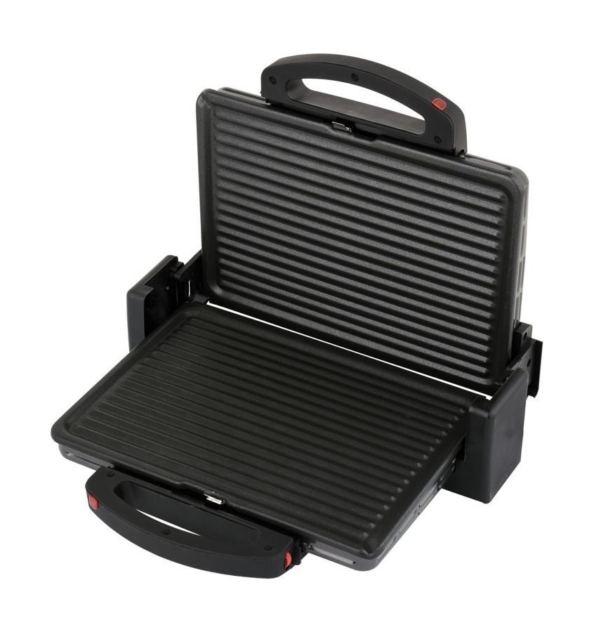 Grill elektryczny przeznaczony do szybkiego przygotowania mięs, ryb, warzyw i tostów. Możliwość blokady górnej płyty grzewczej na maksymalnej wysokości pozwala na przyrządzanie produktów metodą opiekania (zostawienie przestrzeni) lub - po dociśnięciu płyty do produktów - poprzez smażenie. Dodatkowym atutem jest możliwość wyjęcia i komfortowego umycia płyt grzewczych.