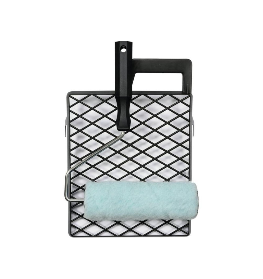 Lekki wałek malarski o długości 18 cm w zestawie z kratką z tworzywa sztucznego w rozmiarze 255x210 mm do odciskania wałka z nadmiaru farby.
