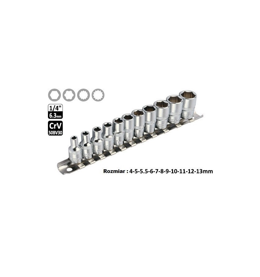 Przeznaczenie: serwis ogólnomechaniczny, samochodowy i maszynowy. Nasadki wykonane ze stali wysokostopowej CrV 50BV30 w technologii kucia na zimno, powierzchnia satynowa, chromowana. Narzędzia wykonane według standardów przemysłowych, które gwarantują ciągłą pracę w największych obciążeniach. W zestawie znajduje się 11 nasadek 6-kątnych.