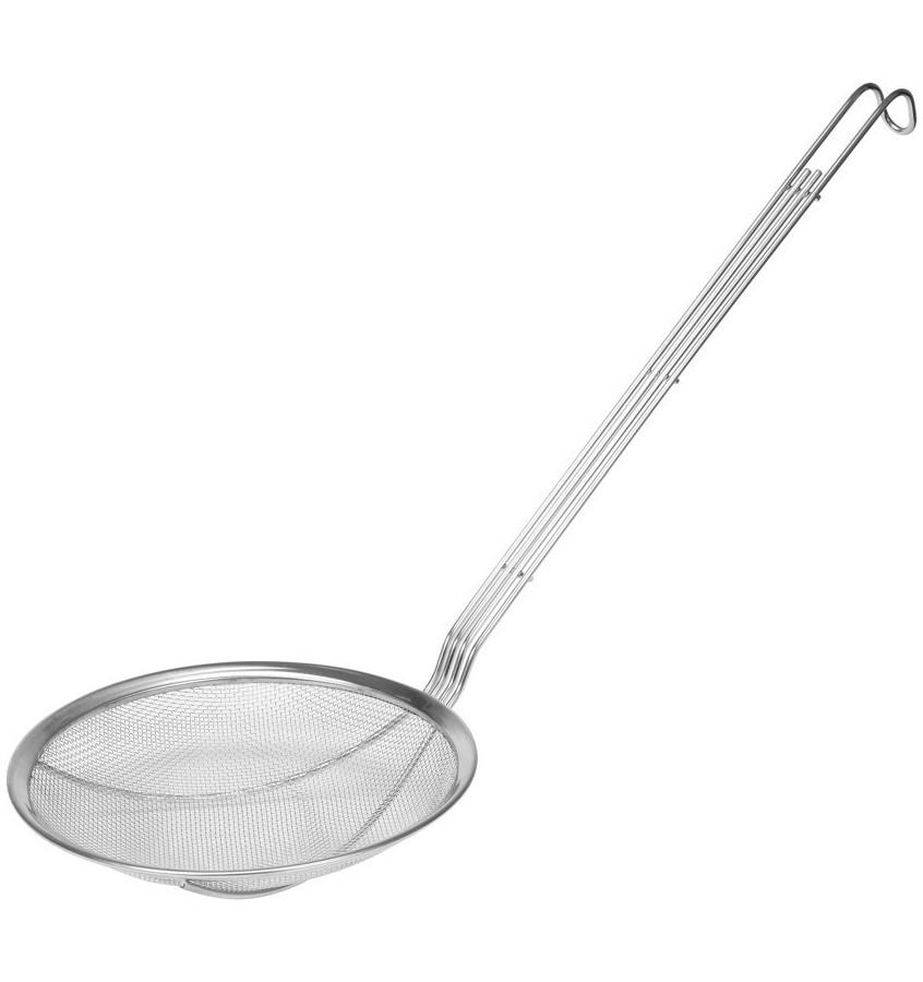 Zewnętrzna średnica cedzaka wynosi 220mm i posiada rant wzmacniający. Natomiast wzmacniana rękojeść o długości 40cm wykonana jest z drutów o grubości 4mm. Dzięki temu łyżka jest bardzo wytrzymała. Cedzak posiada drobne oczka o rozmiarze: 2mm x 2mm.