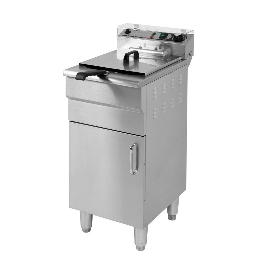 Frytownica wolnostojąca posiada pod spodem dodatkową szafkę o wymiarach 315x370x390mm z zamykanymi drzwiczkami. Wewnątrz szafki, na wysokości 32cm znajduje się kranik spustowy, umożliwiający spuszczenie ze zbiornika oleju. Jest to szczególnie przydatna funkcja, dzięki której wymiana oleju odbywa się bardzo szybko. Poza tym umożliwia zlanie starego oleju bezpośrednio do kanistra, minimalizują w ten sposób ryzyko rozlania go. Szafka osadzona jest na czterech nóżkach z regulacją wysokości w zakresie 13,5~16cm.