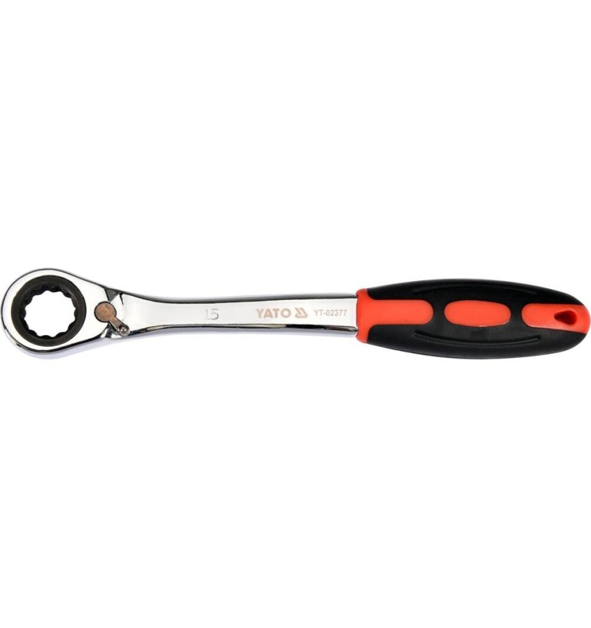 Klucz z grzechotką oraz odgiętym profilem przeznaczony do odkręcania śrub. Polecany serwisom motoryzacyjnym.