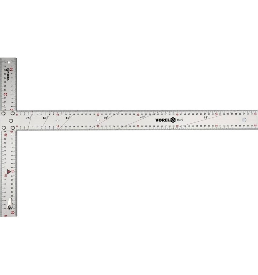 Ramiona długość 600 x 390 mm z zaznaczoną trwale podziałką milimetrową na wszystkich krawędziach. Na krótszym ramieniu kątownika znajduje się zapadka blokująca, ułatwiająca jego mocowanie podczas pomiarów.
