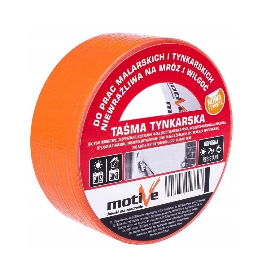 Taśma tynkarska Motive jest taśmą chroniącą budynek podczas remontu elewacji, tynkowania, malowania, gipsowania i prac murarskich. Taśma może być pozostawiona na powierzchni przez okres do 2 tygodni (na zewnątrz) i do 21 dni wewnątrz bez pozostawiania resztek kleju.