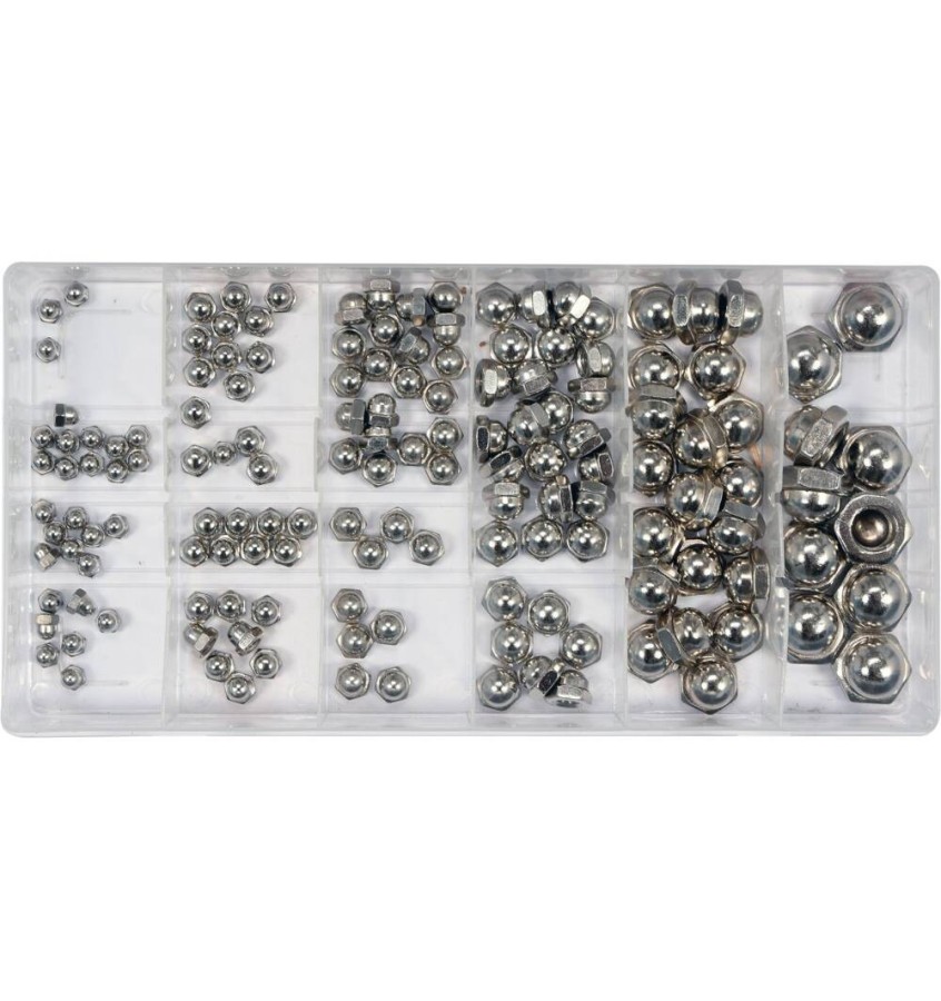 Zestaw 150 sztuk nakrętek metrycznych kołpakowych/zamkniętych. Zestaw zawiera rozmiary M3, M4, M5, M6, M8, M10. Całość umieszczono w wygodnym opakowaniu typu 'sortownik'.
