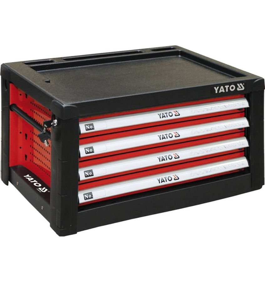 Profesjonalna szafka warsztatowa wyposażona w 4 centralnie zamykane szuflady. Posiadają one prowadnice kulkowe oparte na mechanizmie wielo-kulowym do dużych obciążeń. Szafka warsztatowa ma plastikowy blat roboczy z materiału ABS. Krawędzie szafki zabezpieczone są odpornym na uderzenia materiałem. Szafka malowana proszkowo posiada najwyższy standard wykonania. Całkowite wymiary szafki warsztatowej: 690 mm x 465 mm x 400 mm. Wymiary wewnętrzne szuflad: 533 mm x 397 mm x 55 mm.