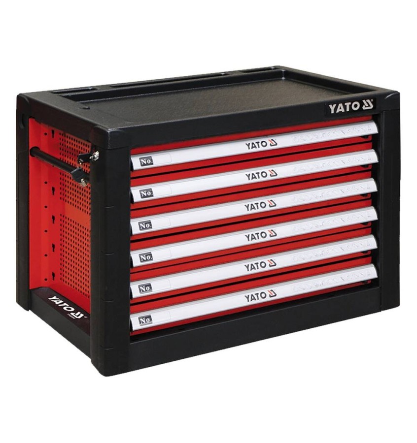 Profesjonalna szafka warsztatowa wyposażona w 6 centralnie zamykanych szuflad. Posiadają one prowadnice kulkowe oparte na mechanizmie wielo-kulowym do dużych obciążeń. Szafka warsztatowa ma plastikowy blat roboczy z materiału ABS. Krawędzie szafki zabezpieczone są odpornym na uderzenia materiałem. Szafka malowana proszkowo posiada najwyższy standard wykonania. Całkowite wymiary szafki warsztatowej: 690 mm x 465 mm x 535 mm. Wymiary wewnętrzne szuflad: 533 mm x 397 mm x 55 mm.