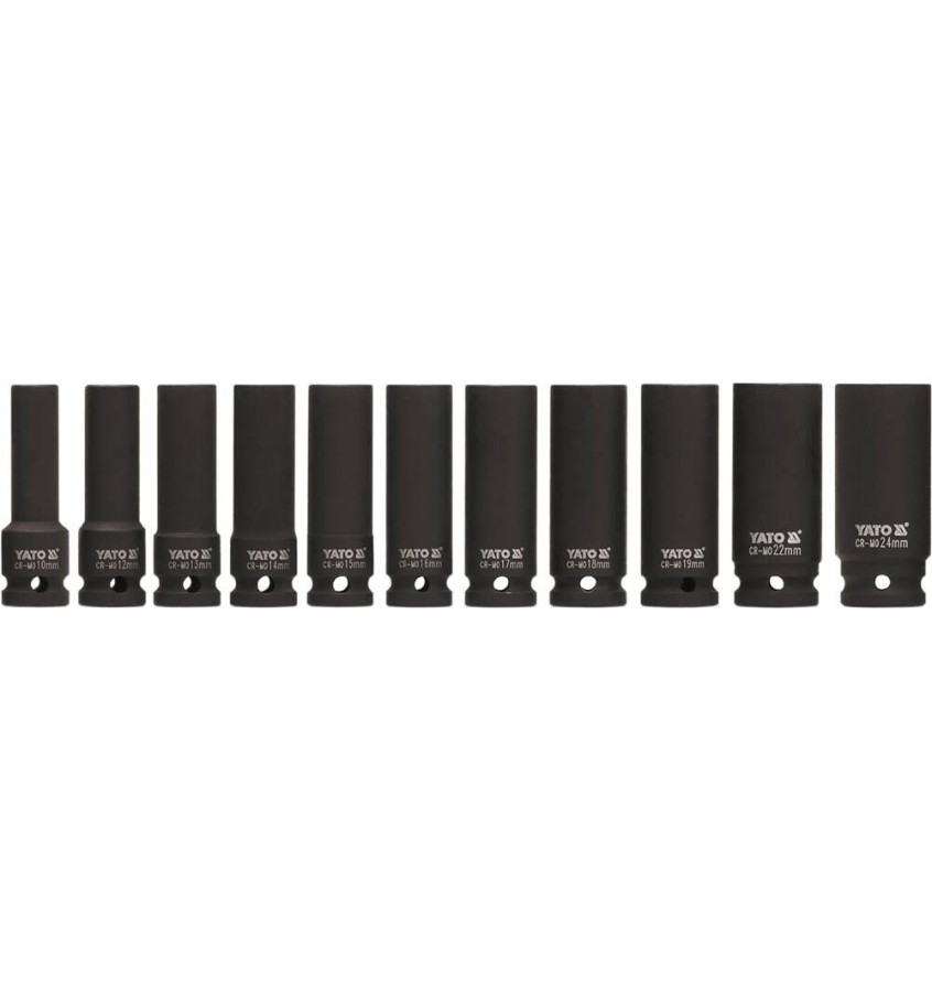 Nasadki udarowe Yato długie - komplet 11 kluczy nasadowych. Specjalistyczne nasadki udarowe, współpracują z urządzeniami pneumatycznymi, które pracują w bardzo ciężkich warunkach pod zmiennymi obciążeniami.