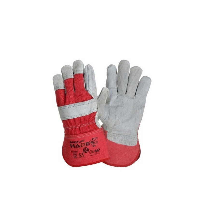 Model HADES to propozycja solidnych rękawic ochronnych wzmacnianych skórą dwoinową bydlęcą. Wysokiej jakości skóra wołowa w kolorze szarym o grubość 1,1 – 1,3mm.Dłoń rękawicy wykonana jest z jednego kawałka skóry, wewnątrz znajduje się podszewka z materiału. Wydłużony, 10 cm mankiet dla jeszcze lepszej ochrony nadgarstków. Strona wierzchnia rękawicy oraz mankiet gumowany wykonany z drelichu w kolorze czerwonym. Rękawica nadaje się do wszelkiego rodzaju prac w środowisku suchym.