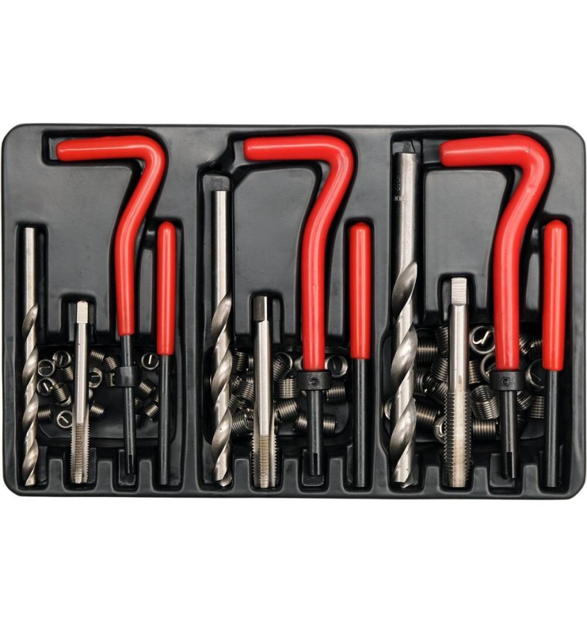 Profesjonalny zestaw do naprawy gwintów M6-M10. Gwintowniki jednostopniowe nacinają gwint, w który wprowadza się wkładkę spiralną z twardej stali nierdzewnej. Do wprowadzenia wkładki służy pokrętło prowadzące oraz wybijak, który obłamuje wystającą końcówkę wkładki.