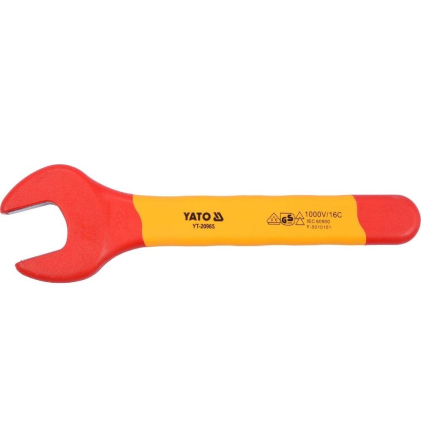 Izolowany klucz płaski marki YATO YT-20965. Wykonany z wytrzymałej, narzędziowej stali chromowo-wanadowej CrV. Wielokomponentowa rękojeść z certyfikatem VDE zapewnia izolację do 1000 V, dzięki czemu narzędzie może być stosowane podczas pracy przy instalacjach niskonapięciowych.