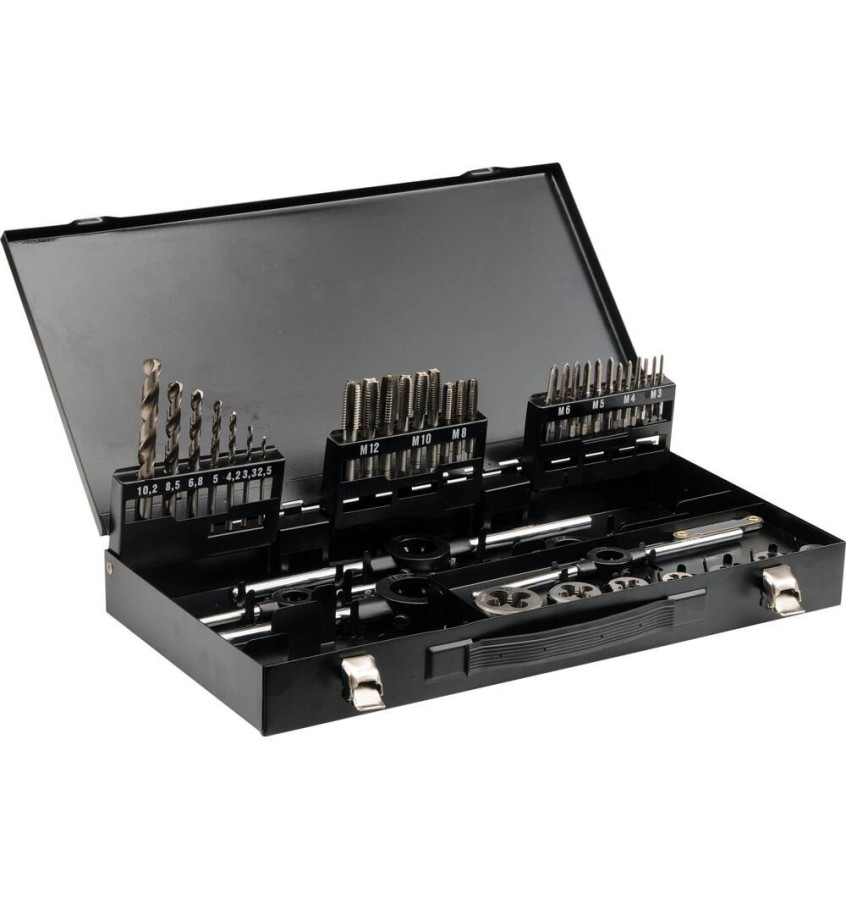 gwintownik ręczny (gwintownik wstępny, zdzierak, wykańczak) x21 (M3x0.5 mm, M4x0.7 mm, M5x0.8 mm, M8x1.25 mm, M10x1.5 mm, M12x1.75 mm), narzynka x7 (M3x0.5 mm, M4x0.7 mm, M5x0.8 mm, M8x1.25 m