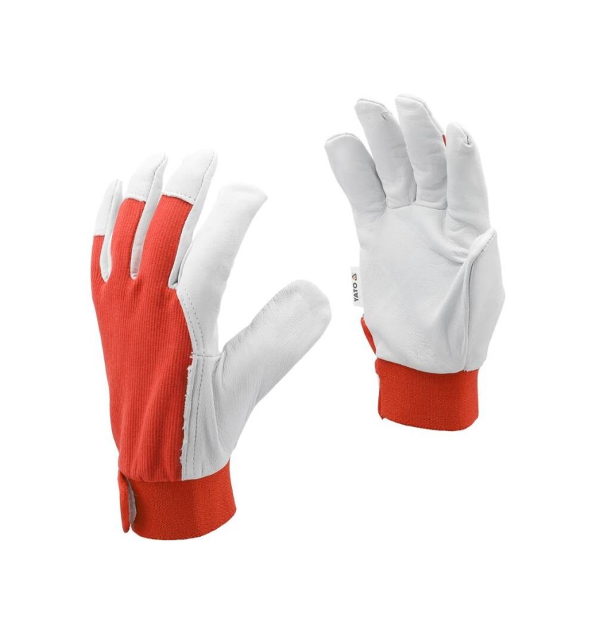 Rękawice robocze lekkie YT-746418 wykonane z miękkiej skóry naturalnej oraz dzianiny bawełnianej w kolorze czerwonym.