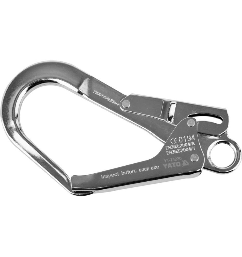 Karabińczyk hakowy, zatrzaśnik YT-74230 z automatyczną zapadką blokującą to element systemu powstrzymywania upadku. Zatrzaśnik przymocowany do liny wykorzystywany jest zazwyczaj jako element zaczepowy do punktów zakotwienia mocowanych w ścianach, stropach czy nadprożach oraz np. podczas pracy na rusztowaniach.