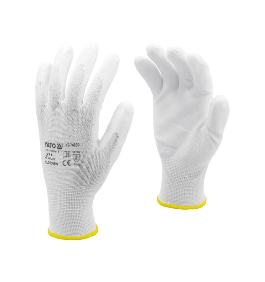 Rękawice robocze ochronne YT-74699 wykonane z białego nylonu, powlekane w części chwytnej białym poliuretanem o zwiększonej odporności na ścieranie.