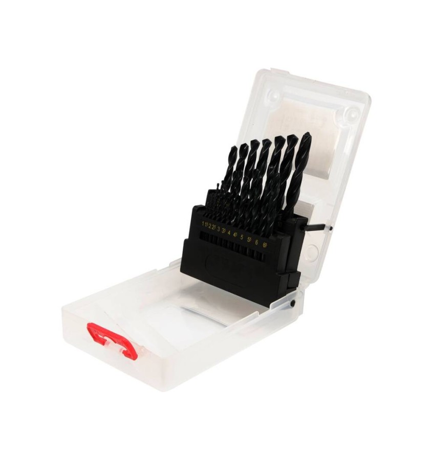 W skład zestawy wchodzi 19 wierteł o średnicy [mm]: 1,0; 1,5; 2,0; 2,5; 3,0; 3,5; 4,0; 4,5; 5,0; 5,5; 6,0; 6,5; 7,0; 7,5; 8,0; 8,5; 9,0; 9,5; 10
