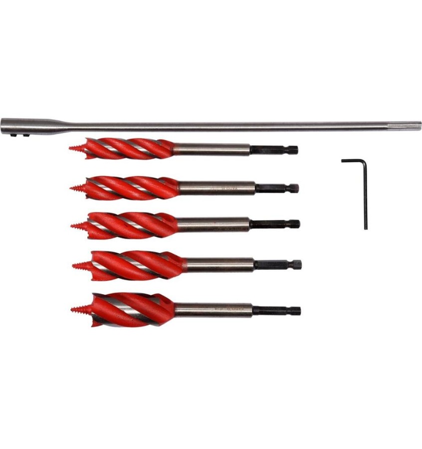 Zestaw zawiera 5 wielozadaniowych wierteł, przedłużkę z 2 uchwytami HEX oraz klucz imbusowy