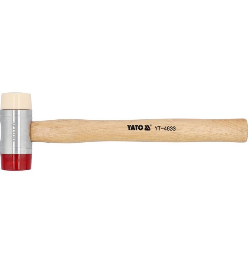 Młotek blacharski 600 g z dwiema wymiennymi końcówkami o średnicy 45 mm. Wymienne końcówki wykonane są z PU (miękka) oraz nylonu (twarda).