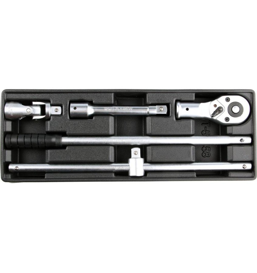 Wkład do szuflady zawierający 4-elementowy zestaw narzędziowy 3/4'. - wkład - grzechotka 3/4' YT-1360 długość 500 mm - przedłużka 3/4' YT-1341 długość 200 mm - przegub 3/4' YT-1352 - pokrętło 3/4' YT-1350 długość 500 mm