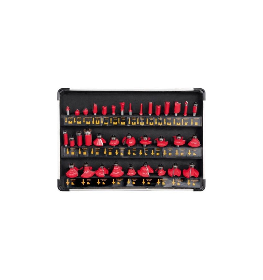 Precyzyjnie wykonane, wysokoobrotowe frezy do drewna. Zestaw 35 frezów, zebrany w funkcjonalnej walizce z szybą ułatwiającą kontrolę i szybki wybór odpowiedniego narzędzia.