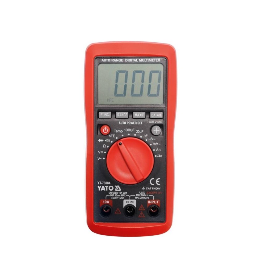Multimetrem (miernikiem elektrycznym) YT-73084 możemy zmierzyć napięcie stałe lub przemienne, prąd stały lub przemienny, a także rezystancję, pojemność kondensatorów, skontrolować diody i zmierzyć temperaturę. Miernik uniwersalny YT-73084 posiada automatyczny zakres, ułatwiający i przyspieszający wykonywanie pomiarów. Ponadto pozwala na pomiary dużych prądów, korzystając z dodatkowych cęgów pomiarowych.