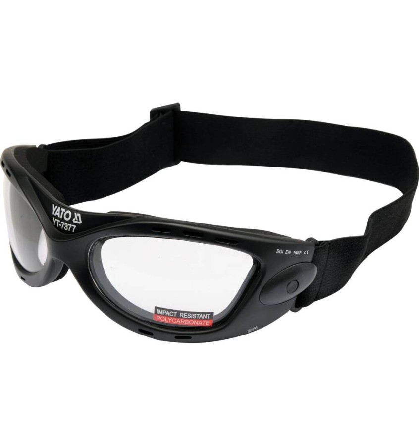 Gogle ochronne YT-7377 mają konstrukcję ramy przypominającą okulary, dzięki czemu doskonale dopasowują się do twarzy. Chronią oczy nie tylko od frontu, ale niemal z każdej strony, stąd zalecane są do pracy w warunkach dużego zapylenia (np. ręczne szlifowanie gładzi szpachlowej) oraz w sytuacjach, gdy nie jesteśmy w stanie przewidzieć kierunku, w jakim przemieści się urobek z obrabianego materiału (np. cięcie drewna wyrzynarką lub piłą typu lisi ogon).