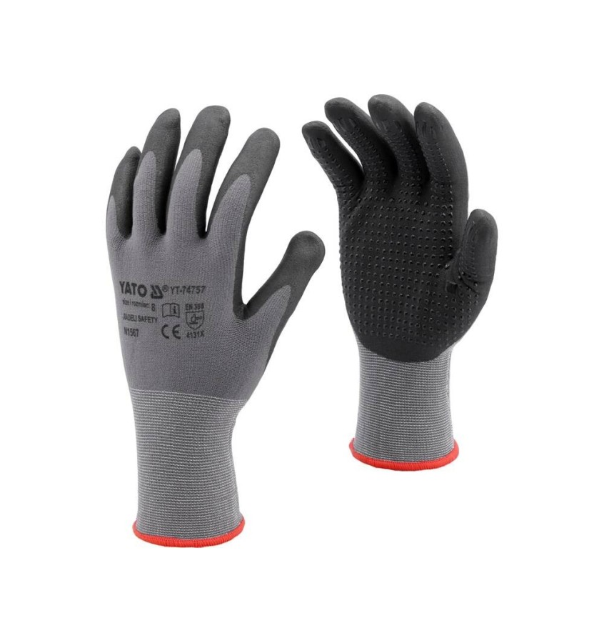 Rękawice YT-74757 zaprojektowano do ochrony dłoni przed zagrożeniami mechanicznymi z dużym naciskiem na poprawienie siły chwytu. Bezszwowa konstrukcja o gęstości ściegu 15 oczek na cal zapewnia najwyższy komfort i doskonałe czucie trzymanego przedmiotu. Powlekanie spienionym nitrylem oraz zastosowanie nitrylowego nakropienia sprawiają, że część chwytna posiada najwyższą według normy odporność na ścieranie, bardzo dobre właściwości antypoślizgowe, a także wysoką odporność na benzynę, olej napędowy, parafinę, rozpuszczalniki, smary itp. Spełniają wymagania norm EN 420 oraz EN 388:2016.