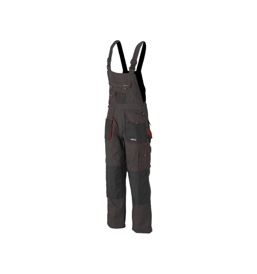 Spodnie robocze na szelkach,rozmiar XXL , uszyte z grubego odpornego na rozdarcia materiału na bazie bawełny i poliestru / 35% i 65% /. Kolor czarny z czerwonymi dodatkami. Posiadają cztery duże, naszywane kieszenie dwie z przodu i dwie z tyłu oraz na nogawce specjalną kieszeń na telefon komórkowy. Z przodu na nogawkach naszyte wzmocnienia z tkaniny poliestrowej przeznaczone do umieszczania osłon na kolana., Klapa na piersiach z dwiema kieszeniami i regulowanym mocowaniem szelek .