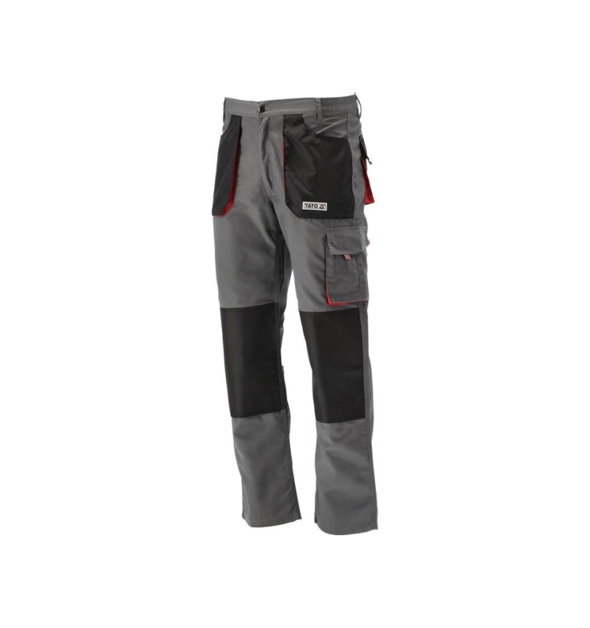 Spodnie robocze uszyte z grubego odpornego na rozdarcia materiału na bazie bawełny i poliestru / 35% i 65% /. Kolor szary z czarnymi i czerwonymi dodatkami. Posiadają cztery duże, naszywane kieszenie dwie z przodu i dwie z tyłu oraz na nogawce specjalną kieszeń na telefon komórkowy. Z przodu na nogawkach naszyte wzmocnienia z tkaniny poliestrowej przeznaczone do umieszczania osłon na kolana. Pas ze szlufkami i wszytą gumą ściągającą.