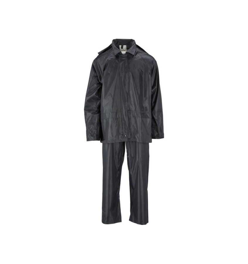 Komplet przeciwdeszczowy 2-częściowy marki Vorel. Kurtka z dwiema dużymi kieszeniami i regulowanym kapturem, spodnie z rozciągliwą gumką w pasie oraz ze szczelinami po bokach przez które możemy sięgnąć do kieszeni spodni. Poliester pokryty PVC to materiał wodoodporny i nie przepuszczający powietrza. Nadmiar ciepła wydostaje się spod materiału za pomocą szczelin wentylacyjnych na plecach oraz otworów pod pachami.