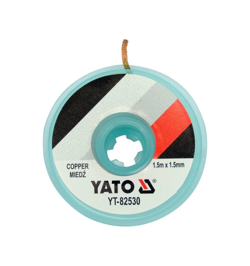 Taśma rozlutownicza YT-82530 w postaci miedzianej taśmy złożonej z wielu pojedynczych nici splecionych w formie knota. Służy do usuwania nadmiaru cyny lub oczyszczania ścieżek z resztek lutowia.