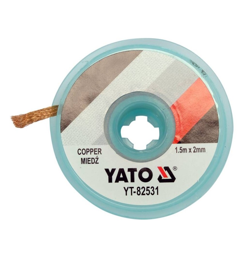 Taśma rozlutownicza YT-82532 w postaci miedzianej taśmy złożonej z wielu pojedynczych nici splecionych w formie knota. Służy do usuwania nadmiaru cyny lub oczyszczania ścieżek z resztek lutowia.