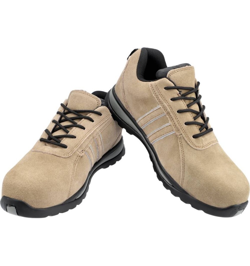 Półbuty nie zawierają metalu. Zarówno wkładka antyprzebiciowa, jak i gumowa podeszwa są elastyczne i - w przeciwieństwie do butów z tradycyjną podeszwą z PU i wkładką stalową - nie ograniczają zgięć śródstopia. Cholewkę z naturalnej skóry zamszowej ozdobiono odblaskowymi wstawkami poprawiającymi widoczność użytkownika.
