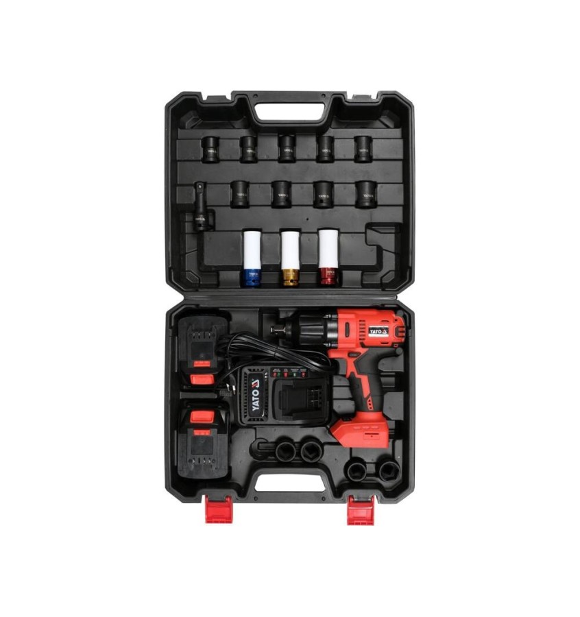 Akumulatorowy klucz YT-828061 w zestawie z nasadkami CrMo, 2 akumulatorami 3 Ah i ładowarką.