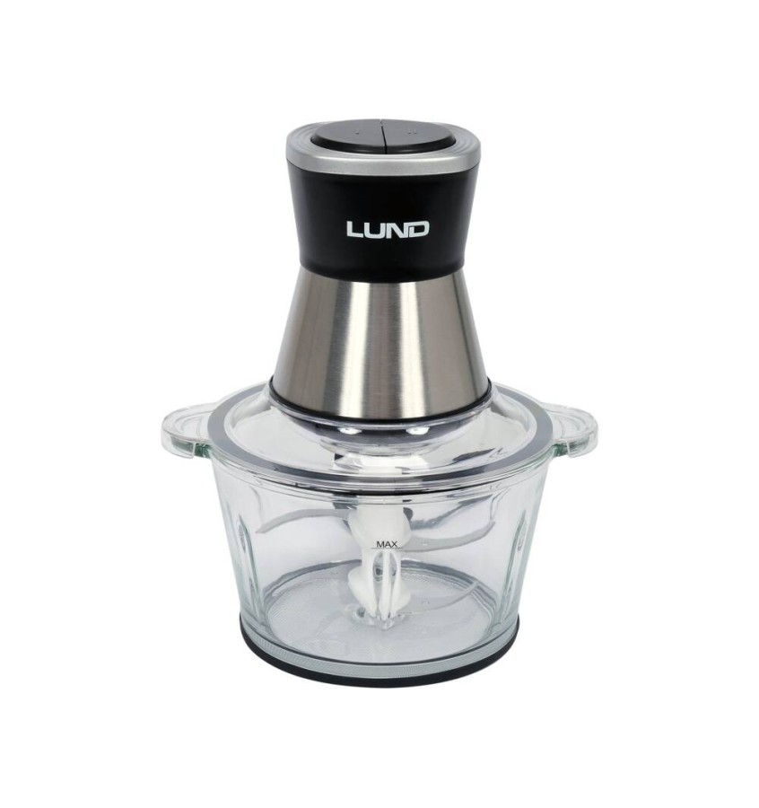 Wielofunkcyjny rozdrabniacz do żywności 3w1 marki LUND. SKuteczność siekania zapewnia mocny silnik 500W oraz ułożone 2-warstwowo cztery ostrza z wysokiej jakości stali nierdzewnej SS420. W zestawie również część do obierania czosnku oraz część do ubijania piany. Dodatkowym atutem urządzenia jest duża, 2-litrowa misa z antypoślizgową gumą oraz skrobak ułatwiający wygarnięcie posiekanych produktów.