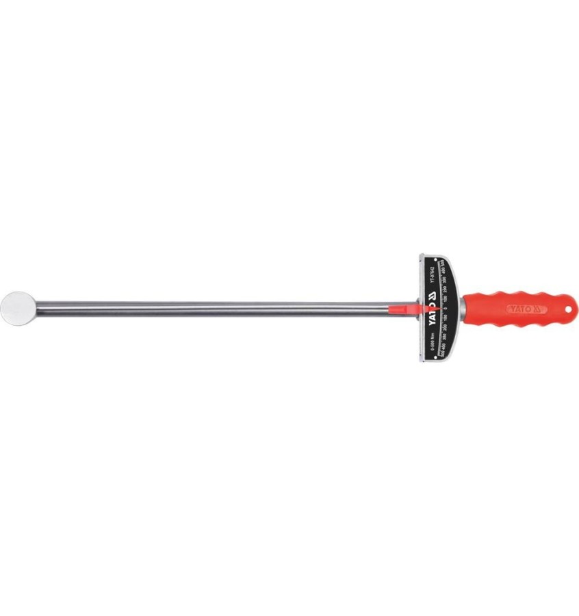 Klucz dynamometryczny marki YATO . Służy do dokręcania połączeń gwintowych z siłą o dokładnie określonym momencie. Zakres klucza wynosi 0-500Nm. Narzędzie działa na zasadzie wahadła. Klucz dynamometryczny wychylny YATO wyskalowany jest w Nm. Narzędzie posiada ergonomiczną rękojeść z tworzywa. Całość wykonana z materiału CrV 6140. Ponieważ w użyciu funkcjonują inne jednostki - poniżej zestawienie porównawcze momentów w różnych jednostkach długości i siły: 1 kG*cm = 13,887 OZ*IN (uncja x cal) 1 kG*cm = 0,867 LB*IN (funt x cal) 1 kG*m = 9,80665 N*m (Niuton x metr) 1 kG*m = 7,233 LB*FT (funt x stopa) 1 FT*LB = 12 LB*IN (funt x cal) 1 dm*N = 14,16 OZ*IN (uncja x cal)
